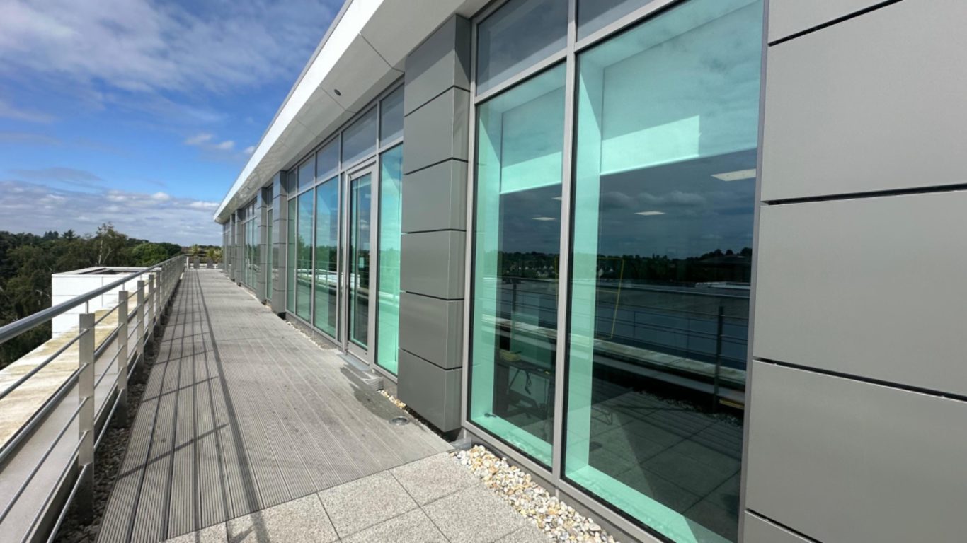 High-access window cleaning for multi-level stores and architectural glass features, performed with advanced safety equipment.